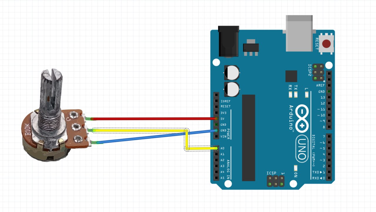 أدر المقبض: يغيّر الجهد على A0 بين 0–5V (قراءة 0–1023).
