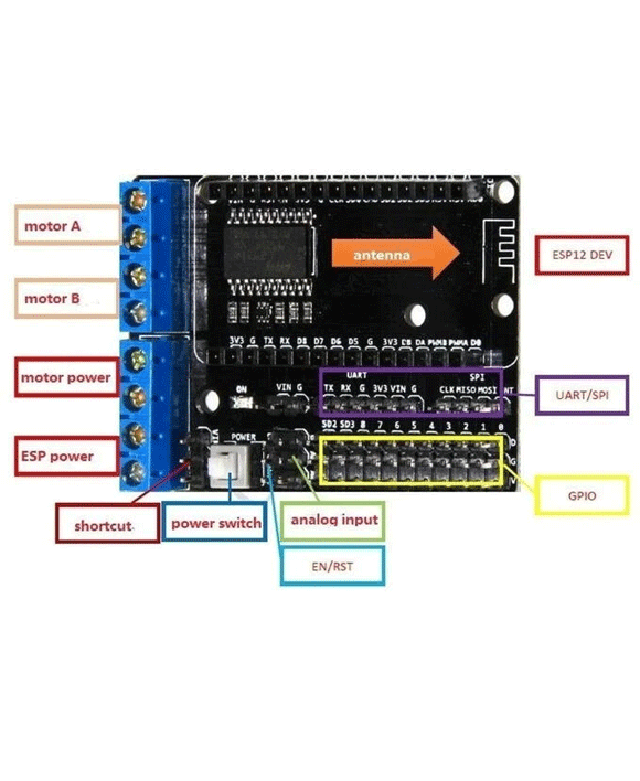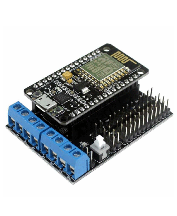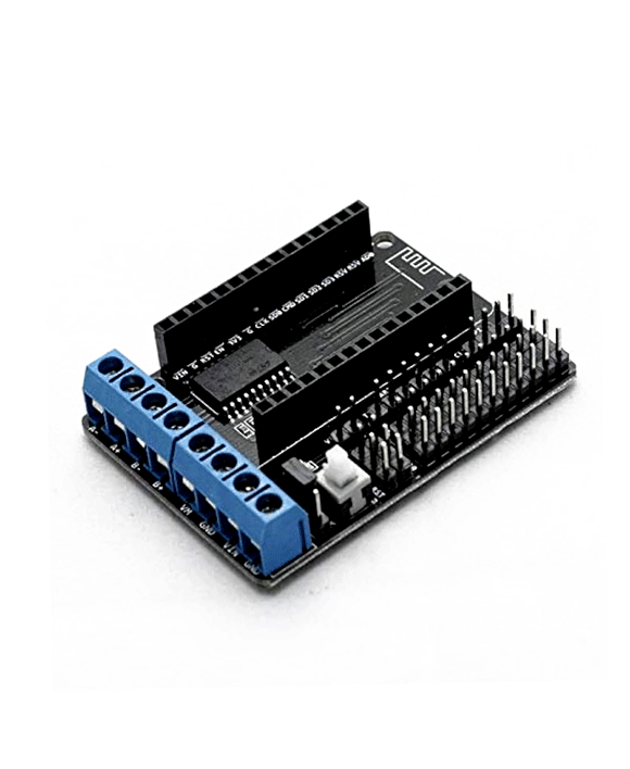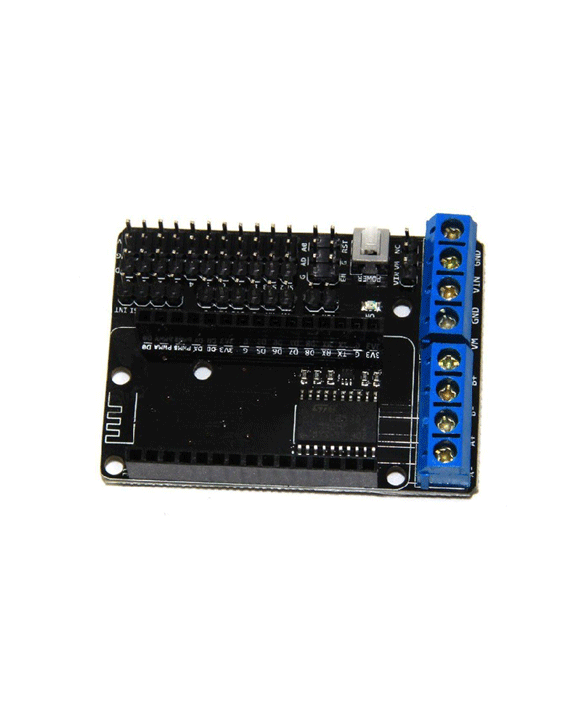 لوحة توسعة (Shield) مخصصة للعمل مع وحدة ESP-12E NodeMCU للتحكم في المحركات. تتيح تشغيل محركين تيار مستمر (DC Motors) أو محرك خطوة (Stepper Motor) باستخدام دارات تشغيل مدمجة، مما يجعلها مناسبة لمشاريع الروبوتات والسيارات الذكية والتحكم عن بعد عبر الواي فاي.